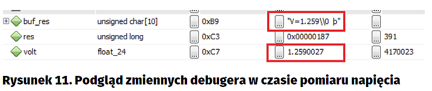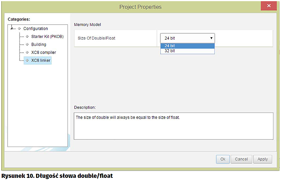 Wygenerowane przez MCC funkcje konfiguracji i wyzwalania konwersji możemy użyć do praktycznych testów działania przetwornika. Ze schematu ideowego modułu Curiosity wynika, że suwak potencjometru modułu można poprzez zworkę J3 połączyć z linią portu RC0 będącą jednocześnie wejściem analogowym AN4. Napięcie na suwaku będzie się zmieniało od 0 V do +3,3 V (Vdd), więc ustawimy w konfiguracji przetwornika Positive reference VDD (rys. 7). Zakres pomiarowy napięcia wejściowego jest równy 3,3 V, a rozdzielczość 10 bitów. Zmiana wartości na ostatnim bicie odpowiada zmianie napięcia równej 3,3 V/1024=3,22 mV. Przeliczanie wartości z wyjścia przetwornika na napięcie wyrażone w woltach będzie polegało na pomnożeniu przez 3,22 i podzieleniu przez 1000. Dokładność wyniku zależy też od długości słowa zmiennoprzecinkowego. W ustawieniach linkera XC8 można wybrać długość 24- lub 32-bitową (rysunek 10). Deklaracje float, double i long double mają taką samą liczbę bitów. Wersja bezpłatna kompilatora obsługuje tylko słowa mieszczące 24 bity, więc używając jej nie mamy większego wyboru.