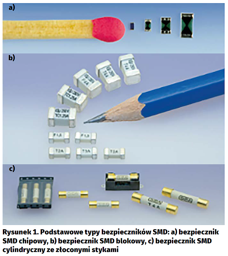 Do tej pory używano głównie bezpieczników rurkowych 5 mm×20 mm z końcówkami do lutowania (rys. 2). W porównaniu z nimi nowy, prostopadłościenny bezpiecznik SMD ma liczne zalety związane z montażem na płytce drukowanej. Ponadto, występuje pozytywny „efekt uboczny”, ponieważ prąd znamionowy może być naniesiony w postaci cyfr i przez to jest zawsze łatwy do odczytania – nie trzeba już posługiwać się trudnymi do rozszyfrowania kodami barwnymi.
