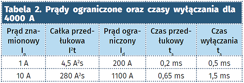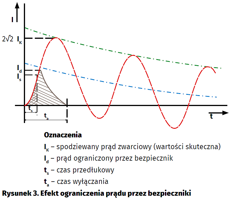 Ale jak to możliwe, aby tak mały element był w stanie wytrzymać prądy zwarciowe do 4000 A? Przyczyna leży w zdolności bezpieczników do wyłączania prądu zwarciowego już na etapie jego wzrostu, to znaczy, działają one metodą ograniczania prądu. Zilustrowano to na rysunku 3, na przykładzie prądu zwarciowego 4000 A. Jeżeli w zwartym obwodzie nie zastosowano by bezpiecznika, prąd 4000 A płynąłby przez kilka okresów, dopóki nie zadziałałoby inne urządzenie ochronne, np. domowy wyłącznik nadmiarowo-prądowy. Jednak wtedy byłoby niestety za późno dla urządzenia, w którym wystąpiło zwarcie; pomijając inne szkody – przypadkowy łuk mógłby pozostawić trwałe uszkodzenia.