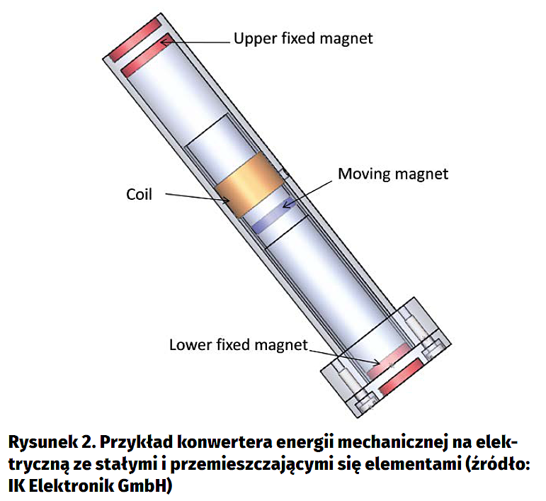 Przykład konwertera energii mechanicznej na elektryczną ze stałymi i przemieszczającymi się elementami pokazano na rysunku 2. Wartość napięcia generowanego przez przetwornik zależy od natężenia i szybkości zmian pola magnetycznego, liczby zwojów oraz dobroci cewki, niezależnie od sposobu wykonania przetwornika, to jest czy ma ruchomą cewkę, czy ruchomy magnes. Naukowcy sprawdzili różne rozwiązania, aby ostatecznie wybrać bazujące na tzw. sprężynie magnetycznej. W tym rozwiązaniu ruchomy magnes stały jest umieszczony pomiędzy dwoma innymi magnesami stałymi, przymocowanymi do obu końców przetwornika w taki sposób, że jest on odpychany przez obie strony. Energia mechaniczna drgań zmienia położenie ruchomego magnesu, który powoduje zmiany pola magnetycznego. Te zmiany są indukują w cewce w energię elektryczną używaną do zasilania sensora.