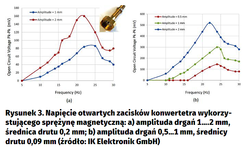Tak wykonany przetwornik doskonale spełnia swoje zadanie i daje się łatwo dostosowywać do warunków panujących w aplikacji. Na rysunku 3 pokazano wyniki badań prototypu wykonanego na TU Chemnitz. Na prezentowanych wykresach naniesiono napięcie występujące przy rozwartych zaciskach cewki (bez obciążenia generatora). Wibracje generowane przez wstrząsarkę były monitorowane za pomocą czujnika laserowego. Ich amplituda mieściła się w zakresie 0,5…1,0 mm, a częstotliwość 5…30 Hz. Częstotliwość rezonansowa przetwornicy wynosi 25…30 Hz, zależnie od liczby zwojów cewki i jej wielkości, a także od amplitudy pobudzenia. Zachowując stałą wielkość cewki, a zmieniając jedynie parametry sprężyny magnetycznej można łatwo zmieniać częstotliwość rezonansową dopasowując wydajność generatora elektrodynamicznego do warunków aplikacji. Jak pokazują wyniki pomiarów, zastosowana metoda „energy harvestingu” pozwala na uzyskanie napięcia rzędu 0,5 V (rys. 3) przy otwartych zaciskach obciążenia.