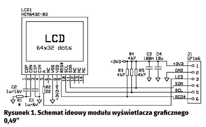 Element ten jest dość nietypowy. Na pierwszy rzut oka wyglądem zewnętrznym, budową, wymiarami oraz sposobem montażu przypomina popularny, miniaturowy wyświetlacz OLED o przekątnej ekranu 0,49”. Podobieństwo do wyświetlacza OLED dotyczy także wyświetlanego obrazu – standardowo są to białe punkty na czarnym tle. Tak naprawdę jest to jednak wyświetlacz LCD, z tłem podświetlanym białą diodą LED. Wyposażono go w kontroler firmy Sitronix typu ST7567A, który komunikuje się z otoczeniem przez interfejs I2C. Wejście zasilania i wszystkie sygnały sterujące wyświetlaczem HMC6432-03 są wyprowadzone na złącze krawędziowe, umieszczone na końcu giętkiej taśmy przeznaczonej do wlutowania w obwód drukowany. Opis sygnałów występujących na złączu wyświetlacza umieszczono w tabeli 1.