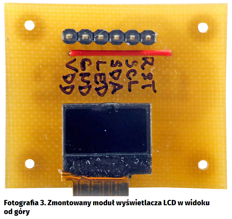 Linie SCL i SDA wyświetlacza są przeznaczone do bezpośredniego dołączenia do wyprowadzeń mikrokontrolera, dokładnie do sprzętowego lub realizowanego w sposób programowy interfejsu I2C. Linia RES może być natomiast sterowana przez jeden z portów I/O mikrokontrolera lub też przez zewnętrzny układ generowania sygnału zerowania, jeżeli taki jest dostępny. W celu uproszczenia sposobu połączenia modułu wyświetlacza z zestawami ewaluacyjnymi mikrokontrolerów wszystkie trzy linie sygnałowe zaopatrzono w rezystory pull-up i przyłączono do napięcia zasilania modułu. Dla celów testowych wyświetlacz zamontowano na jednostronnej płytce drukowanej wykonanej metodą termotransferu. Wygląd tej płytki w widoku od spodu pokazano na fotografii 2, a w widoku od góry na fotografii 3.