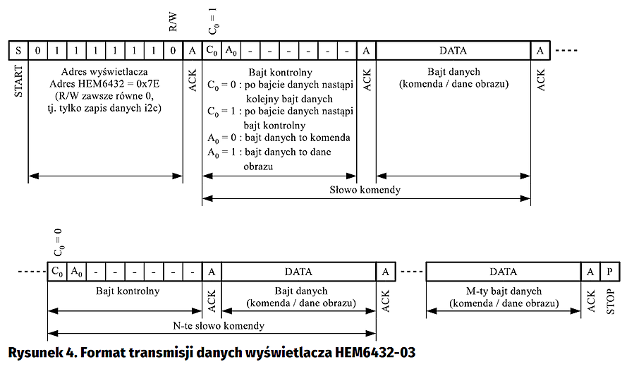 Podstawowym problemem przy implementacji we własnym projekcie wyświetlacza HEM6432-03 jest brak dostępności pełnej dokumentacji technicznej tego elementu. W Internecie można znaleźć jedynie fragmentaryczne dane tego wyświetlacza. Niestety, nie jest też dostępna dokumentacja kontrolera ST7567A. Co prawda można znaleźć karty katalogowe starszej wersji tego układu, tj. ST7567, jednak kontroler LCD w tej wersji nie obsługuje interfejsu I2C, który został użyty w wyświetlaczu HEM6432-03. Na szczęście analiza kart katalogowych innych sterowników monochromatycznych wyświetlaczy LCD produkowanych przez firmę Sintronix pokazuje, że producent ten we wszystkich swoich układach implementuje w interfejsie I2C ten sam protokół komunikacji. Pokazano go na rysunku 4.