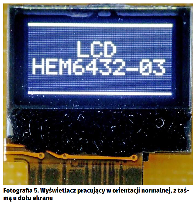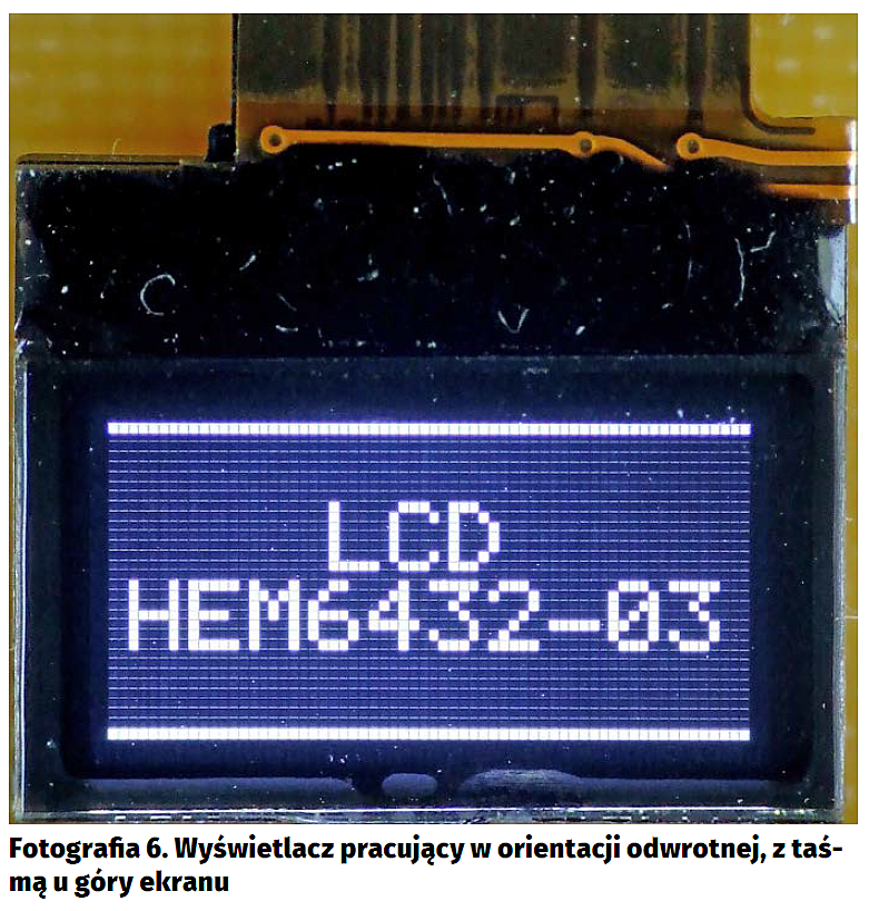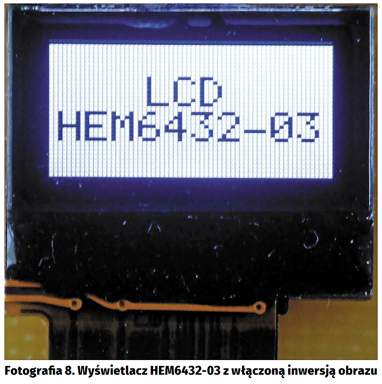 Dysponując przedstawionymi powyżej informacjami, można bez większego trudu napisać bardziej zaawansowane funkcje wyświetlające na wyświetlaczu HEM6432-03 teksty czy też predefiniowane grafiki. Dołączony do artykułu kod demonstracyjnego programu zawiera w module lcdHEM6432.c kompletną bibliotekę obsługi omawianego wyświetlacza, wspierającą również oferowane przez ten wyświetlacz sprzętowe tryby obsługi obrazu, np. inwersję (fotografia 8).