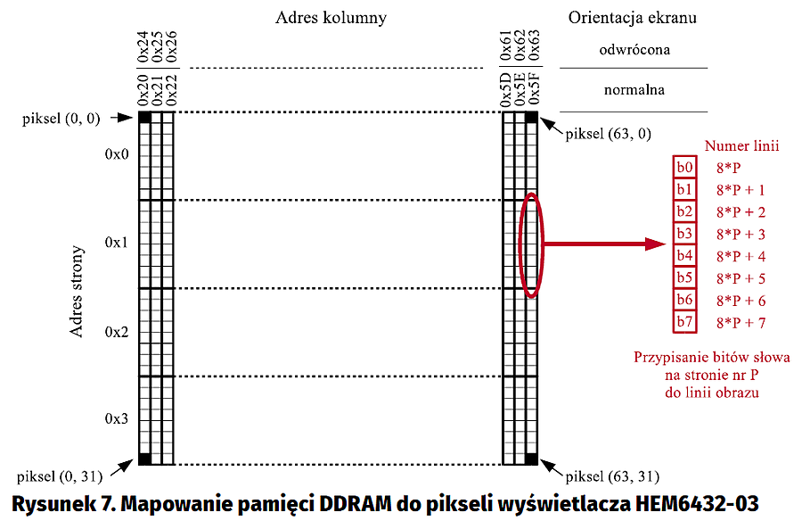 Zapis danych do pamięci DDRAM wyświetlacza HEM6432-03 rozpoczyna się od ustawienia adresu strony pamięci komendą Set Page Address oraz adresu kolumny komendami Set column address (MSN) i Set column address (LSN). Proponowaną funkcję realizującą tę operację przedstawiono na linstingu 3. Następnie do pamięci mogą być zapisywane dane obrazu. Po zapisie każdego bajtu danych adres kolumny jest automatycznie inkrementowany, aż do osiągnięcia końca przestrzeni adresowej na danej stronie pamięci (tj. wartości 131), po czym licznik adresujący kolumny zatrzymuje się. Adres strony pamięci nie jest automatycznie inkrementowany. Zmiana adresu strony pamięci wymaga wysłania do wyświetlacza komendy Set Page Address oraz ustawienia licznika adresującego kolumny na początku strony komendami Set column address (MSN) i Set column address (LSN).