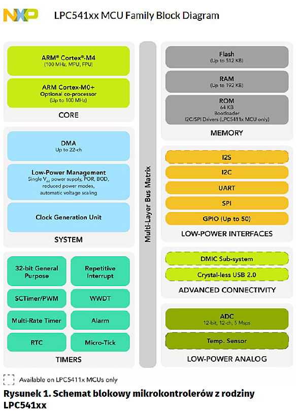 Duża wydajność i uniwersalność mikrokontrolerów LPC5410x powoduje, że będą używane do pracy w aplikacjach wymagających rozbudowanego oprogramowania. Jak informuje tabela 1, jest w nich dostępna pamięć programu Flash o pojemności do 512 kB i danych SRAM do 102 kB. Pozwala to na umieszczenie w pamięci rozbudowanych procedur oraz na przykład bitmap i tablic generatorów znaków używanych w interfejsach graficznych.