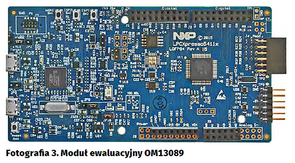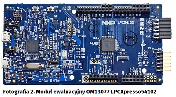 Każdy producent mikrokontrolerów oferuje dla swoich wyrobów moduły ewaluacyjne. Jest to standardowe postępowanie ułatwiające znacznie konstruktorom szybkie zapoznanie się z wybranym elementem i ewentualna weryfikacja możliwości układu, środowiska projektowego, wsparcia programistycznego w postaci gotowych bibliotek itp. Dla rodziny LPC541xx MCU producent przygotował moduł OM1307.