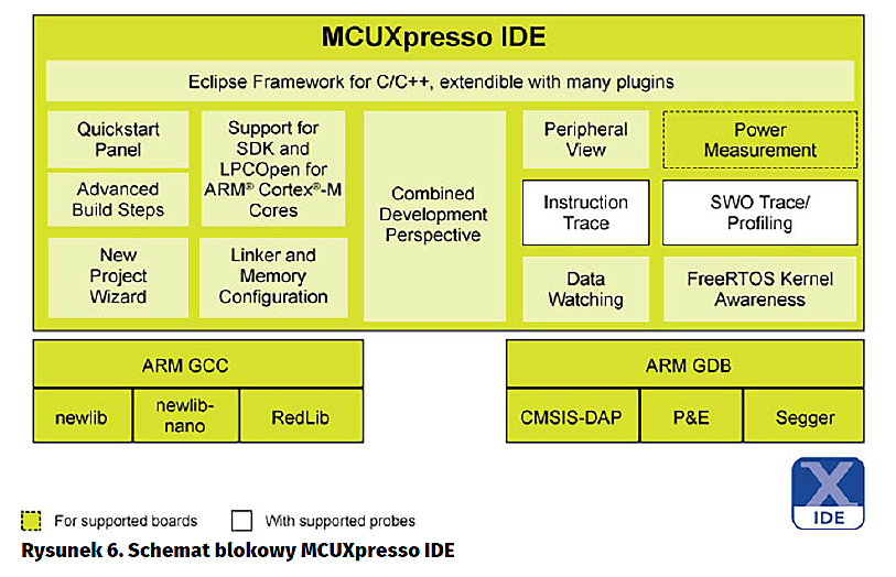 Firma NXP ma w ofercie środowisko IDE MCUXpresso oparte na Eclipse z wbudowanymi funkcjami edycji, kompilacji i debugowania kodu. MCUXpresso jest całkowicie zintegrowane z programatorami/debuggerami firmowych modułów ewaluacyjnych, w tym z modułami opisywanymi wyżej. Schemat blokowy MCUXpresso – IDE został pokazano na rysunku 6. Firmowe biblioteki przygotowane dla mikrokontrolerów NXP są dostępne w pakiecie SDK – MCUXpresso Software Development Kit. Oprócz narzędzi NXP można również korzystać z komercyjnych pakietów oferowanych przez firmy IAR czy Keil. Niestety obecnie nie jest dostępne wsparcie dla modułów opisywanych rodzin w środowisku ARM mbed.