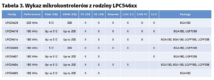 Mikrokontrolery z rodziny LPC546xx wyposażono w rdzeń Cortex-M4, który może być taktowany przebiegiem o częstotliwości do 200 MHz. Szybki, wydajny, 32-bitowy rdzeń w połączeniu z dużą pamięcią programu Flash o pojemności do 512 kB oraz pamięcią SRAM do 200 kB predestynują te układy do zastosowań w aplikacjach wymagających dużej mocy obliczeniowej. Mogą to być układy kontroli budynków, medyczny sprzęt diagnostyczny, wieloprotokołowe węzły komunikacyjne itp. Wykaz mikrokontrolerów z tej rodziny pokazano w tabeli 3, a ich schemat blokowy na rysunku 4. Wiele interfejsów peryferyjnych (komunikacyjne, cyfrowe i analogowe) jest zbudowanych podobnie jak w opisywanych już rodzinach. Jednak z racji większych możliwości obliczeniowych i większej ogólnej wydajności dodano interfejsy realizujące bardziej zaawansowane zadania. Interfejsy szeregowe zostały rozbudowane o zaawansowane moduły transmisyjne: