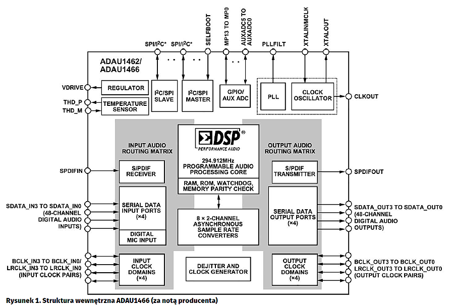 Propozycja jest o tyle ciekawa, że nowe układy są zgodne z poprzednikami pod względem obudowy (LFCSP72) oraz rozmieszczenia wyprowadzeń, co ułatwia dostosowanie istniejących projektów do zwiększonych wymagań współczesnych aplikacji bez ponoszenia nakładów sprzętowych. Dla aplikacji o mniejszych wymaganiach jest przeznaczone ADAU1462 o mniejszej częstotliwości taktowania rdzenia, wynoszącej 147 MHz, mniejszej pamięci programu mieszczącej 16 k słów i danych do 48 k słów.