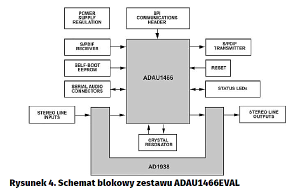 - Płytka uruchomieniowa ADAU1466 z wbudowanym kodekiem ADAU1938, wyprowadzonymi na złącza wszystkimi sygnałami DSP.
