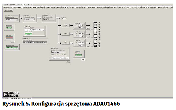 Do programowania ADAU1466EVAL używane jest SigmaStudio w wersji wyższej niż 3.15, które jest udostępnione za darmo. Jest to środowisko graficzne, w którym rysujemy schemat składający się z gotowych, parametryzowanych bloków funkcjonalnych. Zwalnia to z konieczności żmudnego opanowywania asemblera DSP lub zapoznawania się z obszernymi bibliotekami języka C/C++ i zagłębiania się w tony dokumentacji. Dzięki niewielkiemu nakładowi sił potrzebnych na opanowanie tworzenia programów w SigmaDSP jest możliwe tworzenie nawet bardzo złożonych, prototypowych projektów w bardzo krótkim czasie.