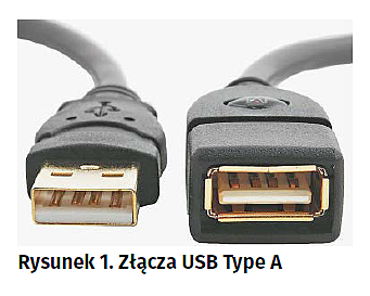 Najbardziej znanym dotychczas złączem USB jest USB Type-A pokazane na rysunku 1. Można go znaleźć w każdym z urządzeń pełniących funkcje hosta lub huba USB. Nawet jeśli standard zmieniał się z wersji z USB 1 na USB 2 i potem na najnowsze USB 3, to to złącze pozostało niezmienione. Gdy urządzenia stają się mniejsze i cieńsze, te stosunkowo duże porty USB po prostu się nie mieszczą. Doprowadziło to do powstania mniejszych złączy USB, takich jak złącza USB mikro i USB mini. Obecnie w hostach USB jest najczęściej złącze USB Type-A, a w urządzeniach USB mikro i coraz rzadziej USB mini.