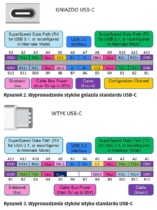 Wyprowadzenia styków gniazd i wtyków standardu USB-C pokazano na rysunku 2 i rysunku 3. W porównaniu z wcześniejszymi standardami mamy więcej styków: