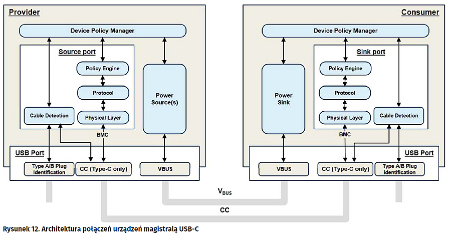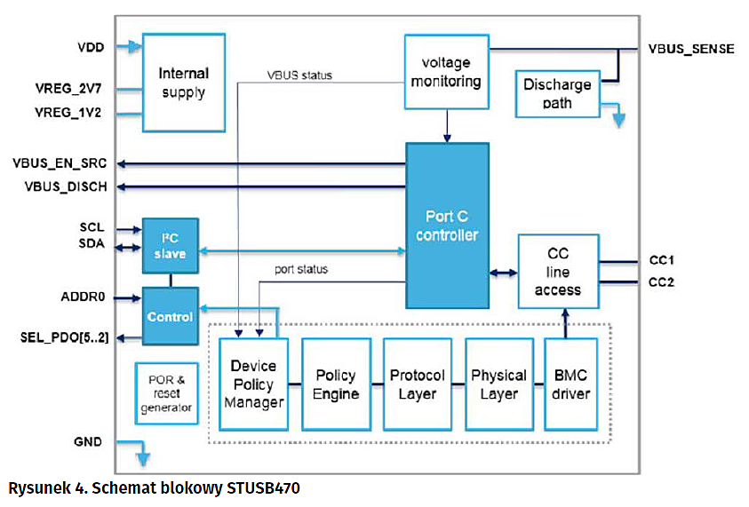 Jeżeli popatrzymy na wyprowadzenia złącza USB-C pokazane na rysunku 2 zobaczymy tam dwa piny oznaczone CC1 i CC2. Tworzą one magistralę przeznaczoną do wykrywania podłączenia do portu i określenia orientacji włożenia wtyku do gniazda. STUSB470 ma wbudowany blok kontrolny CC line access sterujący magistralą CC i współpracujący z warstwą protokołu USB CC oraz sterownikiem PORT C. Blok interfejsu BMC jest przeznaczony do transmisji danych poprzez linie CC z urządzeniem negocjującym parametry zasilania.
