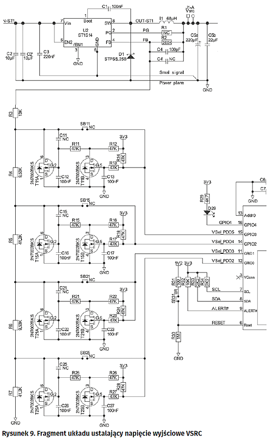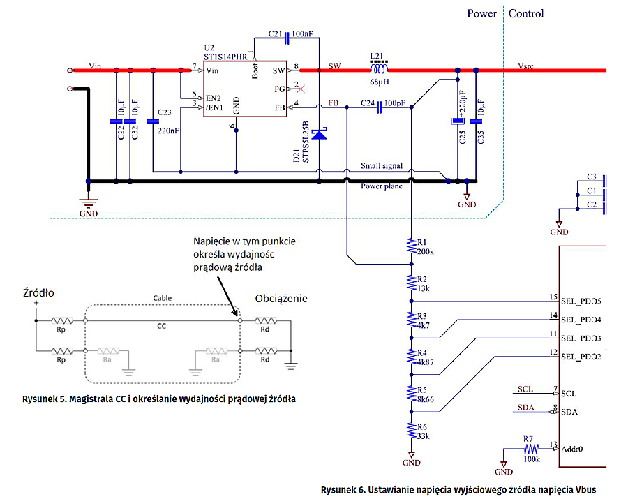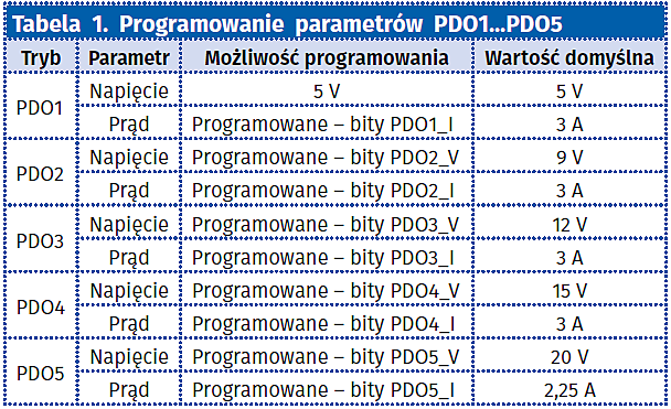 W tabeli 1 umieszczono zestawienie domyślnego przypisania ustawień napięcia i prądu właściwości PDO. Żeby je zmienić, trzeba zapisać odpowiedni rejestr za pomocą interfejsu I2C. Na rysunku 6 pokazano fragment schematu aplikacji STUSB z układem kontroli napięcia wyjściowego. Linie portów SEL_PDO powiązane z ustawieniami PDO dołączają rezystory do dzielnika ustawiającego napięcie wyjściowe regulatora ST1S14PHR. Sposób wyliczenia wartości rezystorów dzielnika został zamieszczony w dokumentacji układu.