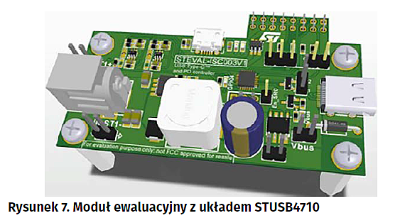 Producent układu – firma STMicroelectronics – przygotował moduł ewaluacyjny z układem STUSB4710 (rysunek 7). Pracuje on jako źródło napięcia Vbus USB PD 2.0 dla portu USB-C i może być użyty do demonstracji działania właściwości STUSB4710. Mimo niewielkich wymiarów, moduł jest rozbudowany i zawiera wszystkie niezbędne elementy do rozpoczęcia pracy z USB-C: