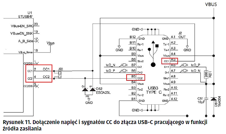 Stan linii CC1 i CC2 oraz napięcie na VBUS są podstawowymi danymi dla pracy stosu USB PD2. Stan linii CC1 i CC2 jest używany do: