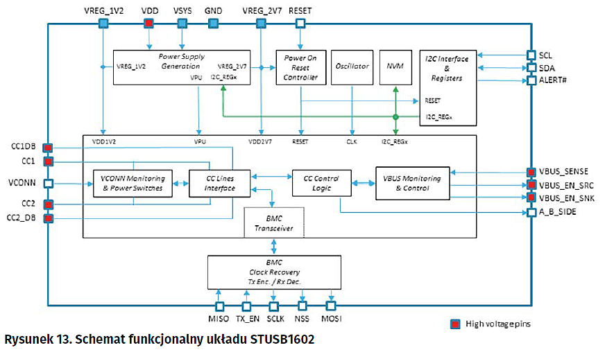 Układ STUSB1602 jest sterownikiem, który może wykonywać wszystkie funkcje zasilania. Jego schemat funkcjonalny pokazano na rysunku 13. Podstawowe funkcje realizowane przez układ są następujące: