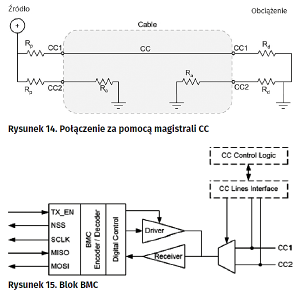 Jak już wiemy, do negocjowania połączenia są używane linie CC1 i CC2 oraz rezystory Rp (podłączenie do źródła zasilania) i Rp (podłączenie do masy). Zasadę działania magistrali CC pokazano na rysunku 14.