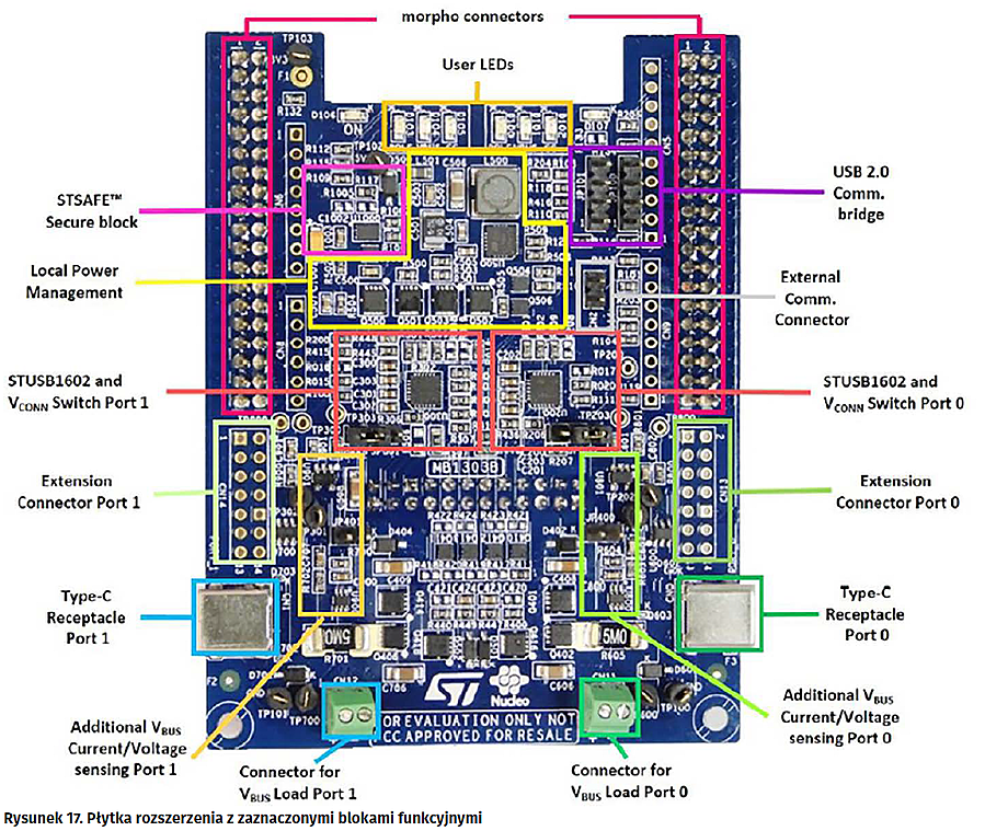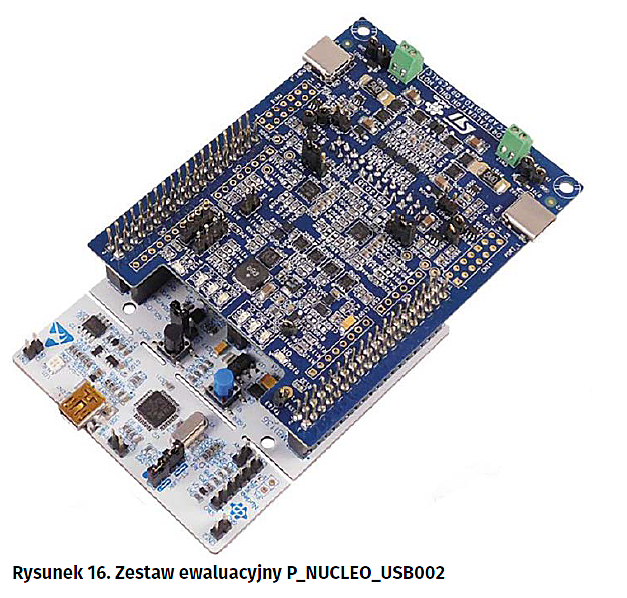 Układ STUSB1602 może być konfigurowany do pracy w funkcji źródła lub obciążenia. Może też negocjować z innym układem parametry zasilania poprzez magistralę CC sprzężoną z interfejsem SPI. Blok interfejsu SPI-CC pozwala na łatwe dołączenie dowolnego mikrokontrolera i przeprowadzenie negocjacji parametrów łącza. Producent układu przygotował zestaw ewaluacyjny składający się z dwóch płytek: P-NUCLEO-USB002 expansion board oraz NUcleo-F072RB. Płyta P_NUCLEO_USB002 expansion board jest wyposażona w: