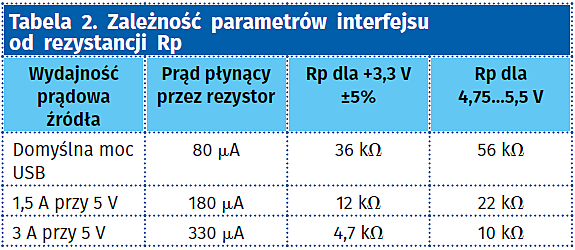 Zależnie od wartości rezystora Rp możliwe jest „zaprogramowanie” wydajności standardowej USB (1,5 A lub 3 A przy +5 V).