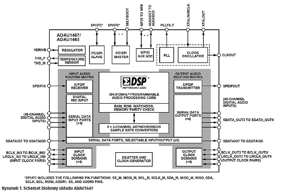 - 48 konfigurowalnych kanałów cyfrowych, 32 bity/192 kHz, (I2S, TDM, LJ, LJ, PCM).