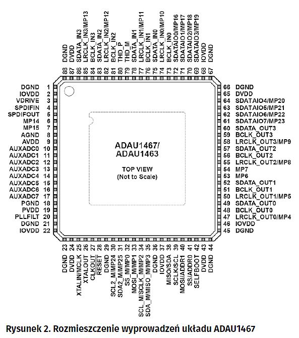 - Miniaturowa obudowa LFCSP88 o wymiarach 12 mm×12 mm (rozmieszczenie wyprowadzeń obudowy procesora pokazano na rysunku 2).