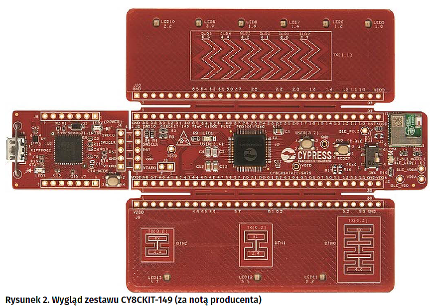 W wypadku CY8CKIT-149 jest kontynuowana idea taniego zestawu uruchomieniowego o budowie znanej z rodziny PSoC4000. Zestaw składa się z niewielkiej płytki podzielonej na pole programatora i procesora wykonanej w formie wtyku do portu USB. Tym razem nie jest to tylko mostek USB/I2C wymagający wgrania bootloadera do procesora docelowego, a pełny programator/debuger Kit-Prog znany w kitów zgodnych z Arduino. Dzięki temu zestaw jest niewielki i pomimo pełnej funkcjonalności niewiele kosztuje, bo jedynie 20 USD. W tej cenie zestaw zawiera dwa pola klawiatur dotykowych, suwak i przyciski wraz z odpowiadającymi sygnalizacyjnymi LED. Znalazło się też miejsce na klasyczny przycisk oraz co ważniejsze na moduł BLE (CYBLE-022001-00), (który w poprzednich zestawach wymagał samodzielnego wlutowania), co zdecydowanie poszerza zakres zastosowań zestawu CY8CKIT-149. Konstrukcja płytki dalszym ciągu może zostać rozdzielona, a standardowy rozstaw 2,54 mm złącz ułatwia wykorzystanie części z procesorem i modułem BLE bezpośrednio np.: w układzie prototypowym, bez ponoszenia dodatkowych kosztów. Wyprowadzenia GPIO procesora dostępne są na złączach szpilkowych. Płytka pozbawiona jest osobnego złącza dla programatora Prog3, ale w dalszym ciągu można podłączyć go przez złącze J2 (po odłamaniu programatora wbudowanego).