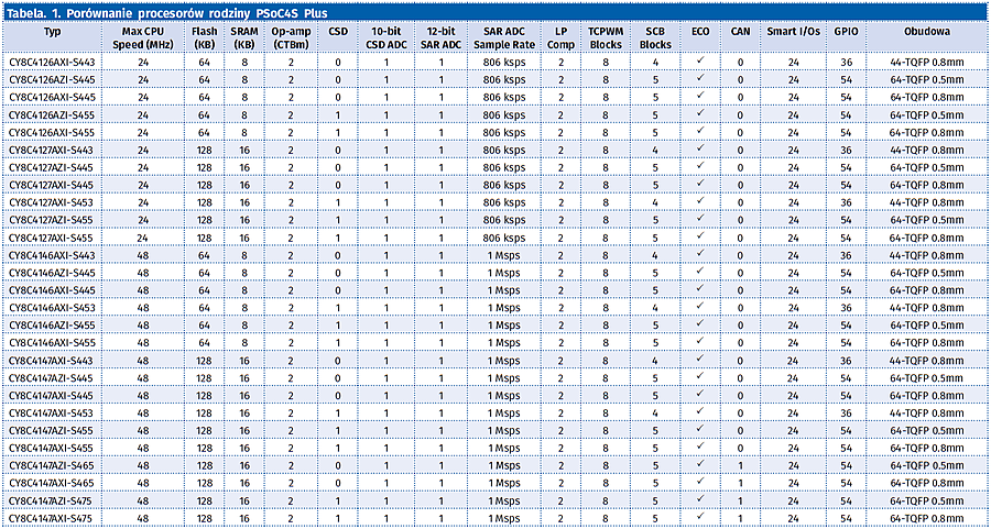 Preferowane obszary zastosowania to inteligentne interfejsy użytkownika z klawiaturą dotykową, układy sterowania i kontroli w produktach konsumenckich i przemysłowych, w tym aplikacje IoT. Nie wyklucza to oczywiście innych obszarów zastosowań, w których ogromną rolę odgrywa wydajność, elastyczność, dobre wyposażenie oraz przystępna cena układu. Porównanie wyposażenia poszczególnych procesorów przedstawia tabela 1.