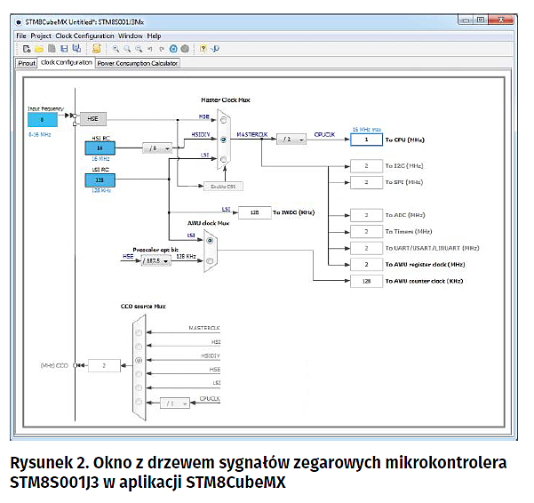 Wartościowym dodatkiem do dokumentacji technicznej pozwalającym lepiej zrozumieć blok sygnałów zegarowych mikrokontrolera STM8S001J3 jest program komputerowy STM8CubeMX. Okno Clock Configuration tego programu udostępnia użytkownikowi pełne drzewo sygnałów zegarowych i co więcej, umożliwia jego graficzną edycję. Dokonując samodzielnie zmian wartości poszczególnych podzielników i zmian ustawień multiplekserów, użytkownik natychmiast widzi, jak te zmiany wpływają na częstotliwość sygnałów taktujących CPU, pamięć oraz peryferia. Widok okna Clock Configuration programu STM8CubeMX pokazano na rysunku 2.