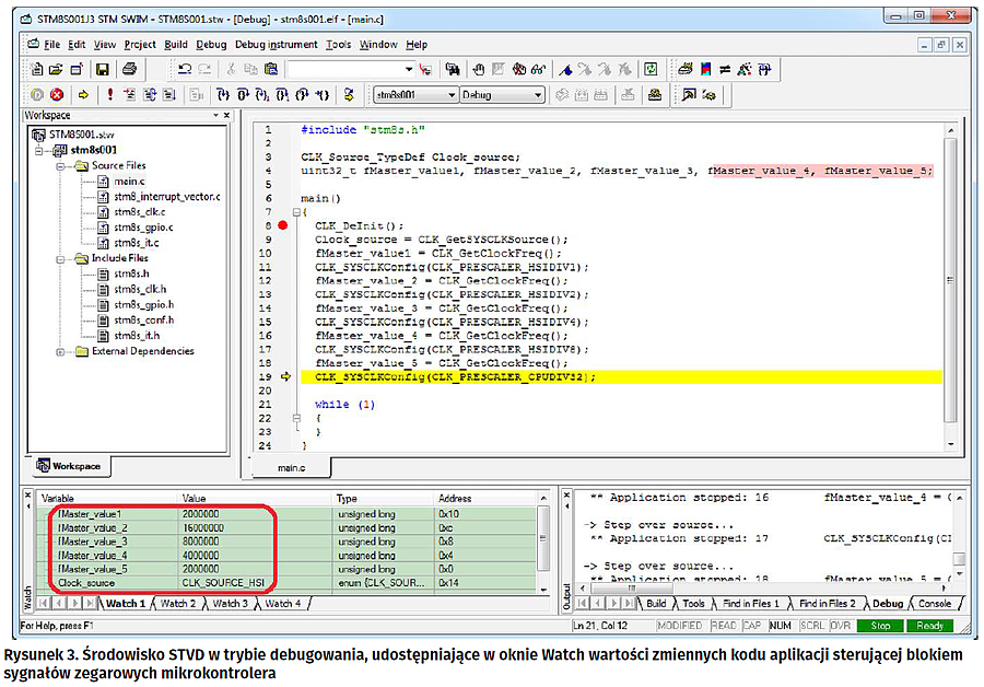 Działanie aplikacji łatwo jest zweryfikować. Należy skompilować projekt, a następnie wgrać plik wynikowy do pamięci mikrokontrolera i otworzyć tryb debugowania. Teraz należy dodać do okna Watch stworzone w kodzie zmienne (należy najechać kursorem myszy na każdą zmienną, kliknąć na niej prawym przyciskiem myszy i z menu kontekstowego wybrać opcję QuickWatch…). Po uruchomieniu aplikacji należy zaobserwować, jakie wartości zostały zwrócone przez funkcje i wpisane zostały tym samym do zmiennych. Proces ten pokazano na rysunku 3. Widać, że mikrokontroler rozpoczyna pracę, korzystając ze źródła sygnału zegarowego HSI (zmienna Clock_source ma wartość CLK_SOURCE_HSI) i częstotliwość tego sygnału ma wartość 2 MHz (zmienna fMASTER_value_1 ma wartość 2000000). Następnie gdy zmienia się podzielnik HSIDIV kolejno na 1, 2, 4 oraz 8, częstotliwość sygnału zmienia się adekwatnie (wartości zmiennych fMaster_value_2/3/4/5 to odpowiednio 16000000, 8000000, 4000000 oraz 2000000). Na końcu aplikacji dodatkowo zmieniany jest podzielnik CPUDIV na 32, co skutkuje zmianą sygnału fCPU na 62.5 kHz (2 MHz/8/32).