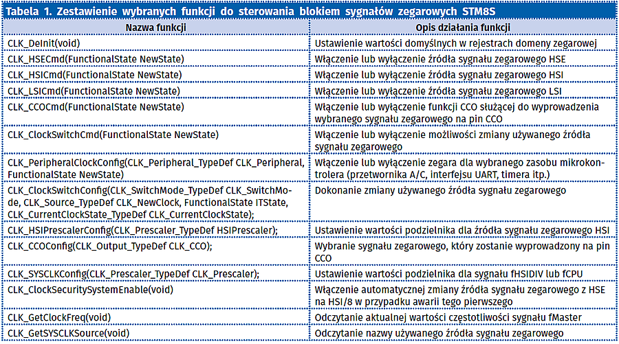 Aby w prosty sposób skonfigurować blok sygnałów zegarowych układu STM8S001J3, warto w aplikacji użyć bibliotek SPL (Standard Peripheral Library) przygotowanych dla mikrokontrolerów STM8S. Pliki stm8s_clk.h oraz stm8s_clk.c udostępniają szereg funkcji do tego celu. Ich zestawienie umieszczono w tabeli 1.