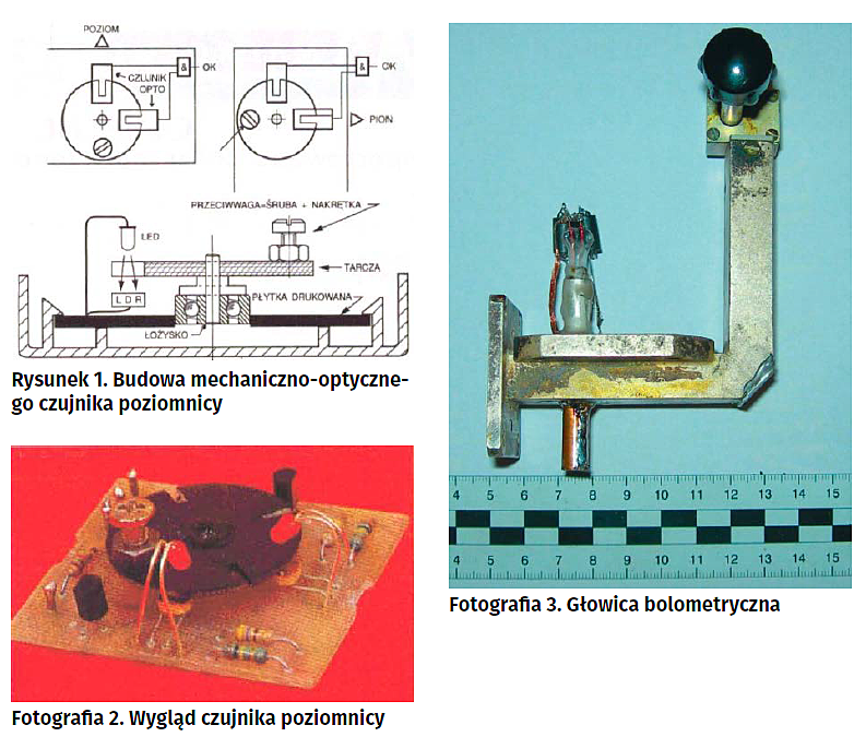 W czasach, gdy pojawiały się pierwsze numery Elektroniki Praktycznej dostępność elementów elektronicznych nie była jeszcze tak dobra jak dzisiaj. Nie był to zresztą tylko nasz, polski problem. W początkowym okresie Elektronika Praktyczna utrzymywała bliskie związki z jej odpowiednikiem francuskim. Na łamach EP dość często były publikowane artykuły z zaprzyjaźnionego pisma. Dzisiaj możemy powiedzieć, że francuscy konstruktorzy, podobnie jak nasi, musieli sobie wtedy jakoś radzić ze zdobywaniem potrzebnych elementów, a gdy nie było to możliwe... po prostu budowali je we własnym zakresie. Niewątpliwym hitem tamtych projektów była poziomnica elektroniczna opisana w artykule „Poziomica elektroniczna” (EP5/93). Nawiasem mówiąc w tytule wkradł się błąd ortograficzny, gdyż poziomica to linia na mapie wyznaczająca jednakową wysokość terenu, natomiast przyrząd do wyznaczania poziomu do poziomnica. Już w leadzie artykułu dowiadujemy się, że mamy do czynienia z cyt.: „nowoczesną wersją znanej wszystkim poziomicy z pęcherzykiem powietrza”. Nowoczesność przejawiała się sygnalizacją poziomu za pomocą diod świecących oraz sygnałem dźwiękowym z brzęczyka. Początkowo autor chciał wykorzystać w konstrukcji miniaturowe wyłączniki rtęciowe, lecz zrezygnował z nich z powodu małej powtarzalności wyników. Postanowił więc zbudować czujnik we własnym zakresie, a konstrukcję oparł... o niewyważone koło. Elementem powodującym niewyważenie był wkręt z nakrętką umieszczony na małym krążku. Były w nim wykonane szczeliny, przez które przepuszczano światło z czujników optycznych. Do pełni szczęścia wystarczyło dodać względnie prosty układ logiczny i sygnalizacyjny. Czułość tak zbudowanego sensora była uzależniona od szerokości szczelin, których nie można jednak zmniejszać bez konsekwencji. Szczelina musiała bowiem przepuszczać wystarczająco dużo światła, aby mogły prawidłowo działać czujniki optyczne. Budowę czujnika zastosowanego w poziomnicy przedstawiono na rysunku 1, a na fotografii 2 widzimy jego realizację praktyczną. Układ był zmontowany na dwóch płytkach drukowanych. Na jednej zawarto część elektroniczną obsługującą urządzenie, druga to sam sensor.