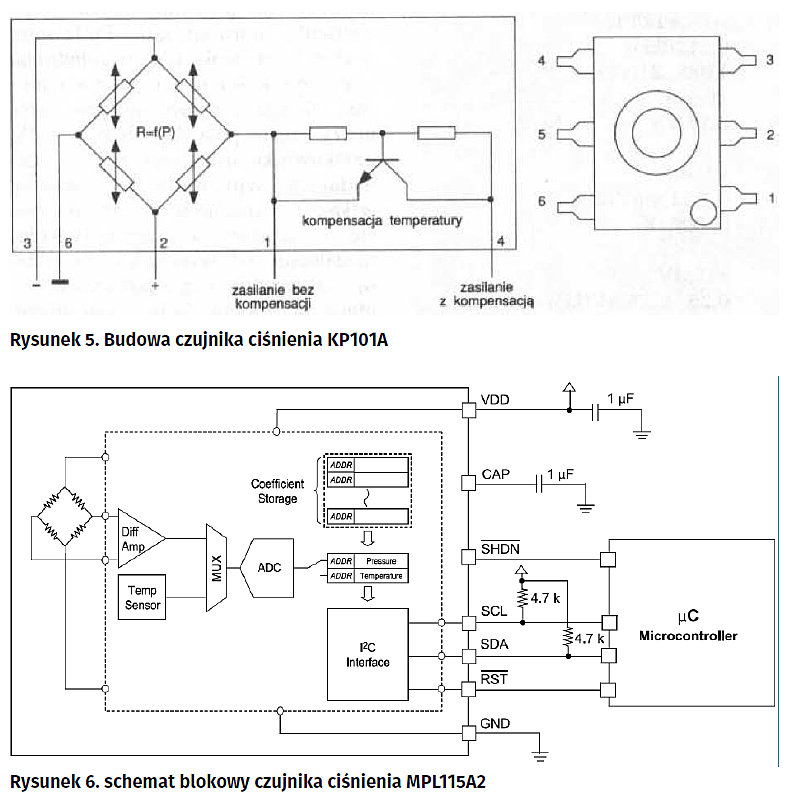 Skoro jesteśmy przy pomiarach ciśnienia, warto prześledzić jak zmieniały się publikowane w EP konstrukcje wykorzystujące czujniki ciśnienia. Pierwszym opisanym przez nas projektem, w którym zastosowano czujnik ciśnienia był barometr/ wysokościomierz autorstwa Piotra Góreckiego (EP 9/94). Użyty w tej konstrukcji czujniki KP101A może z dzisiejszego punktu widzenia wydawać się nieco archaiczny, ale wtedy był jednym z najtańszych elementów tego typu i z tego powodu cieszył się sporym zainteresowaniem. Zaletą (chyba jedyną) czujnika KP101A był zintegrowany w półprzewodnikowej strukturze obwód kompensacji temperaturowej (rysunek 5). Elementami wrażliwymi na ciśnienie były rezystory dyfuzyjne połączone w konfiguracji mostka. Do pomiaru wymagany więc był zewnętrzny wzmacniacz instrumentalny, o który musiał zadbać projektant. W opisywanym urządzeniu autor zbudował go w oparciu o tanie i popularne wzmacniacze operacyjne, co jednak, jak wynika z przedstawionych w artykule szacunków, nie powinno negatywnie wpływać na parametry urządzenia.