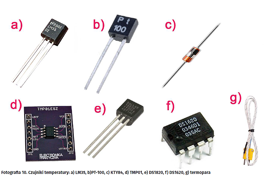 25 lat temu nie było jeszcze tak wielu, tak wspaniałych czujników, jakimi dysponujemy dzisiaj. Pomiary temperatury realizowano najprostszymi środkami, które jednak były jak na tamte czasy zupełnie zadawalające. Największą popularnością cieszyła się prosta metoda wykorzystująca powtarzalną zależność dryftu temperaturowego złącza półprzewodnikowego. Parametr, z którym na co dzień walczymy do upadłego tu okazuje się idealnym narzędziem pomiarowym. Jedną z pierwszych prób zbudowania układu mierzącego temperaturę zaproponował Piotr Górecki w projekcie uniwersalnego termometru-regulatora (EP9/93). Elementem pomiarowym mogła w nim być dioda krzemowa np. BAVP17...21 lub BAY95 lub tranzystor ze zwartym kolektorem z bazą. W tamtych czasach powszechnie dostępne były tranzystory w metalowych obudowach co sprzyjało krótkim czasom odpowiedzi przy nagłych zmianach temperatury. Jako diody najlepiej sprawdzały się te w szklanych obudowach. Elementy te były często łączone szeregowo po 3, 4 w celu zwiększenia napięcia pomiarowego.