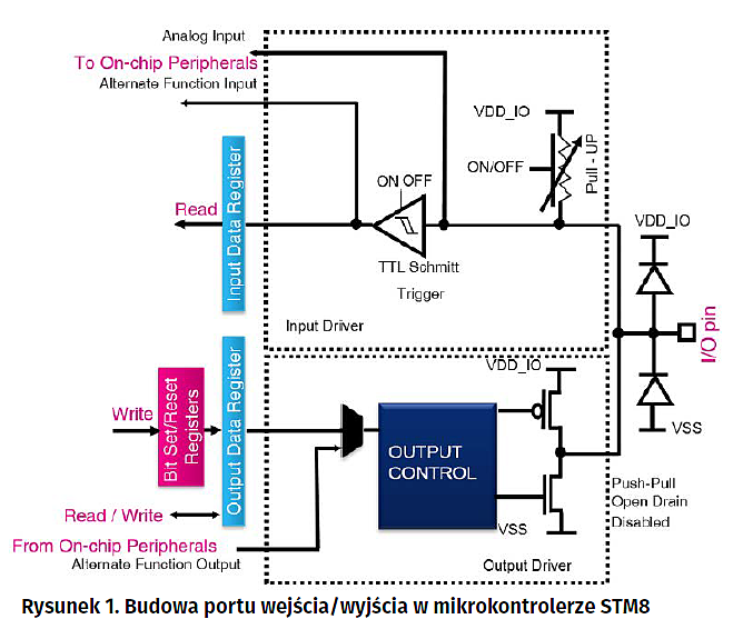 Port wejścia/wyjścia w mikrokontrolerze STM8 składa się z następujących bloków: