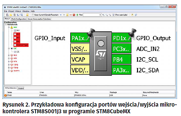 Narzędziem ułatwiającym pracę z portami mikrokontrolera STM8S001J3 jest program komputerowy STM8CubeMX. Dzięki niemu programista może w prosty sposób (za pomocą graficznego interfejsu użytkownika) sprawdzić, jakie są możliwe konfiguracje (tryby wejścia, wyjścia i alternatywne) dla wszystkich portów mikrokontrolera. Przykładowy scenariusz pokazano na rysunku 2.