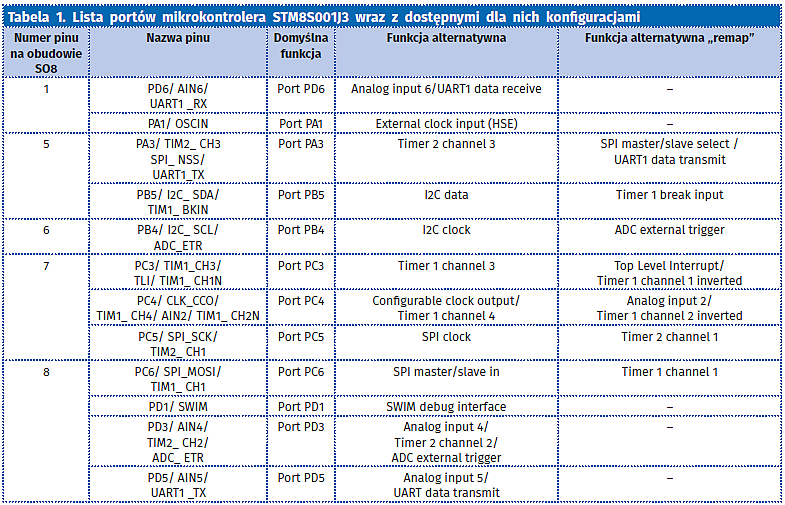 Jak już wspomniano wcześniej, wybrane porty wejścia/wyjścia mogą pracować w trybie alternatywnym, co oznacza wykorzystanie portu przez inne peryferia mikrokontrolera. W tabeli 1 przedstawiono zestawienie wszystkich portów mikrokontrolera STM8S001J3 wraz z dostępnymi dla nich konfiguracjami.