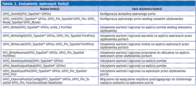 Aby w prosty sposób skonfigurować porty wejścia/wyjścia układu STM8S001J3, a następnie nimi sterować, warto w aplikacji użyć bibliotek SPL (Standard Peripheral Library) przygotowanych dla mikrokontrolerów STM8S. Pliki stm8s_gpio.h oraz stm8s_gpio.c udostępniają szereg funkcji do tego celu. Ich zestawienie zaprezentowano w tabeli 2.