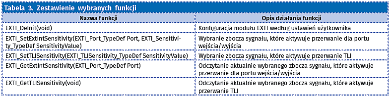Biblioteki SPL udostępniają funkcje dla przerwań zewnętrznych, których użycie ułatwia pisanie kodu aplikacji. Funkcje te znajdują się w plikach stm8s_exti.h oraz stm8s_exti.c. Ich zestawienie zaprezentowano w tabeli 3.