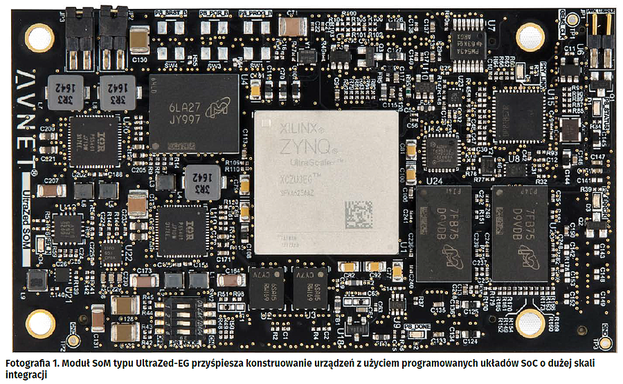 Moduł SoM zawiera układ Xilinx Zynq UltraScale+ – ZU3EG. Moduł ten charakteryzuje się zastosowaniem najnowszej generacji wysoce zintegrowanych, wydajnych, programowalnych układów SoC, które łączą zaawansowaną technologię FPGA z wielordzeniowym systemem procesorowym, szybką zintegrowaną pamięcią i szybkimi interfejsami komunikacyjnymi. Jednak niezależnie od tego, czy używa się ich w module SoM, czy też na tradycyjnej płytce prototypowej z układami FPGA, zapewnienie prawidłowego zasilania tych zróżnicowanych zasobów wiąże się z wieloma wyzwaniami konstrukcyjnymi.