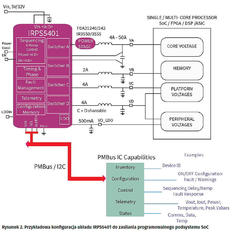 Avnet zdecydował się na użycie dwóch układów PMIC firmy Infineon typu IRPS5401 na płytce swojego modułu SoM UltraZed-EG. Każdy z nich zawiera pięć przetwornic DC/DC oraz jeden regulator LDO (rysunek 2). Dla zapewnienia dodatkowej elastyczności przy zasilaniu rdzenia prądem o natężeniu do 40 A, jeden z kanałów przetwornicy DC/DC ma wyjście PWM, które może być używane do zarządzania zewnętrznym układem stopnia mocy, takim jak TDA21240.