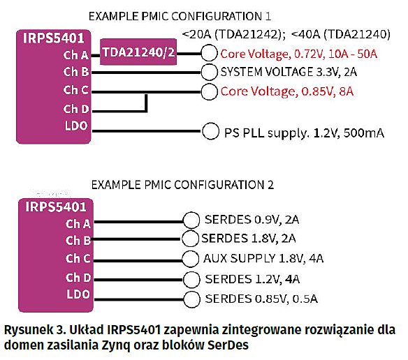 Infineon opracował układ IRPS5401 dla zapewnienia skalowalnego rozwiązania dla systemów zasilania wymaganych przez układy FPGA i programowalne układy SoC wytwarzane przez wielu producentów. Może on usprawnić zarządzanie zasilaniem w systemach wykorzystujących układy Zynq UltraScale+, począwszy od podstawowej, najprostszej rodziny ZU2, a skończywszy na wysokowydajnej serii ZU19. Podstawowe linie układów Zynq UltraScale+ CG wyposażone są w dwurdzeniowy procesor ARM Cortex-A53 oraz dwurdzeniowy R5. Bardziej wydajne układy Zynq UltraScale+ EG łączą czterordzeniowy Cortex-A53, dwurdzeniowy R5 z koprocesorem graficznym Mali-400, a rodzina Zynq UltraScale+ EV charakteryzuje się z kolei czterordzeniowym Cortex-A53, dwurdzeniowym R5, Mali-400 i sprzętowym kodekiem video H.264/H.265.