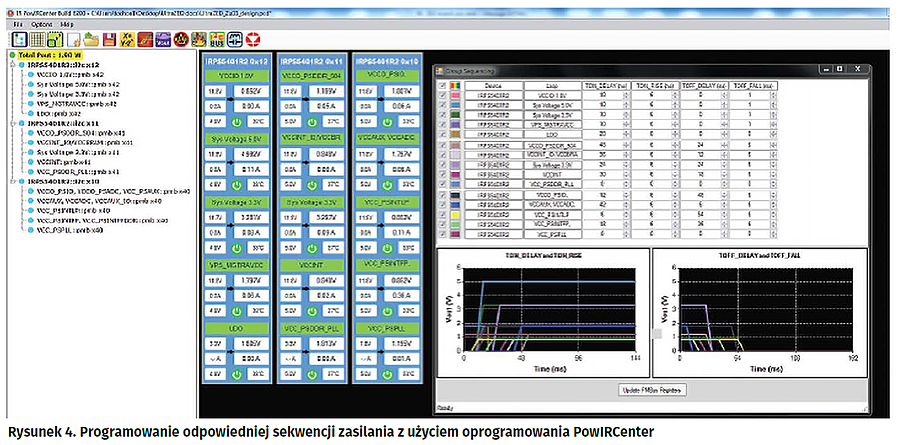 Układ PMIC typu IRPS5401 upraszcza również programowanie prawidłowej sekwencji załączania i wyłączania zasilania. Jest to trudne do wykonania przy projektowaniu zasilacza od przysłowiowego zera. Stosując układ IRPS5401 można szybko zaprogramować odpowiednią sekwencję za pomocą wygodnego w użyciu interfejsu graficznego Infineon PowIRCenter. Czas opóźnienia po włączeniu/wyłączeniu zasilania oraz czas narastania/opadania dla każdej szyny są programowane poprzez zapisanie wymaganych wartości w wewnętrznych rejestrach PMIC (rysunek 4).
