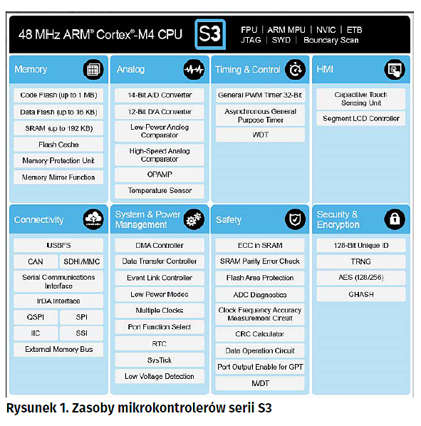 Na rysunku 1 pokazano zasoby procesorów z rodziny S3: pamięci programu i pamięci stałych danych Flash, pamięci danych SRAM i układów peryferyjnych. Zależnie od typu mikrokontrolera mamy do dyspozycji do 1 MB pamięci programu Flash, do 16 kB programowanej stałej pamięci Flash przeznaczonej dla danych użytkownika oraz do 192 kB pamięci danych SRAM.