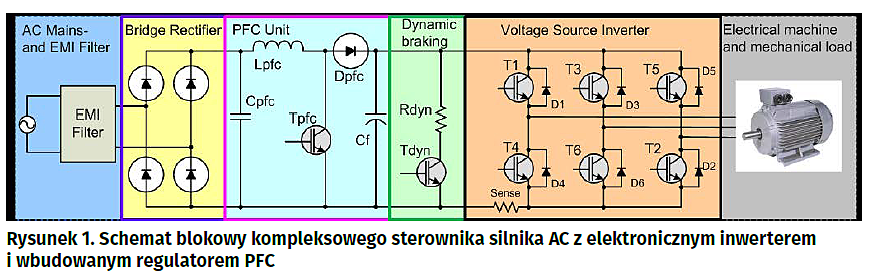Schemat blokowy kompleksowego sterownika z elektronicznym inwerterem i wbudowanym regulatorem PFC pokazano na rysunku 1.