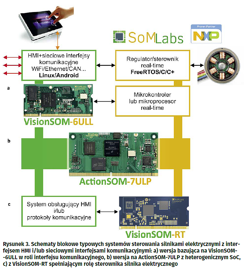 - moduły ActionSOM-7ULP, które dzięki zastosowaniu heterogenicznego układu SoC (Cortex-A7 + Cortex-M4) mogą realizować wszystkie funkcje sterownika/regulatora silnika: rdzeń Cortex-A7 z Linuksem lub Androidem rolę interfejsu komunikacyjnego, szybki rdzeń Cortex-M4 zintegrowany z FPU rolę real-time’owego kontrolera silnika (rysunek 3b).