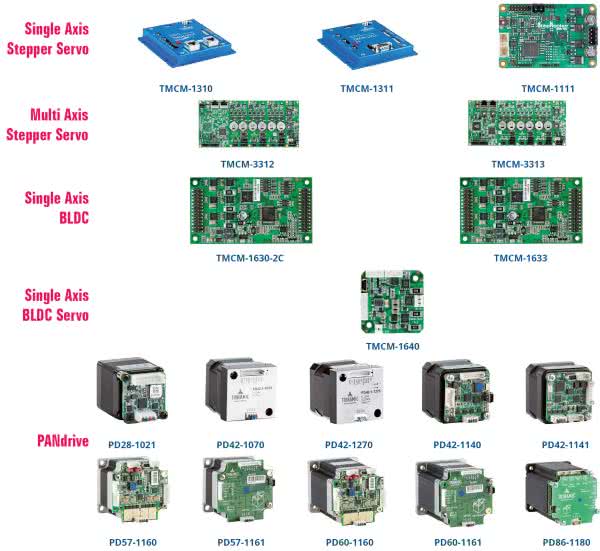 Kolejne grupy produktów Trinamica obejmują jedno- i wieloosiowe sterowniki Stepper Servo, jednoosiowe sterowniki silników BLDC i BLDC Servo, a także rozwiązania PANdrive stanowiące zintegrowany bezpośrednio z silnikiem krokowym moduł sterujący. Produkty te przedstawiono na fotografii 3.
